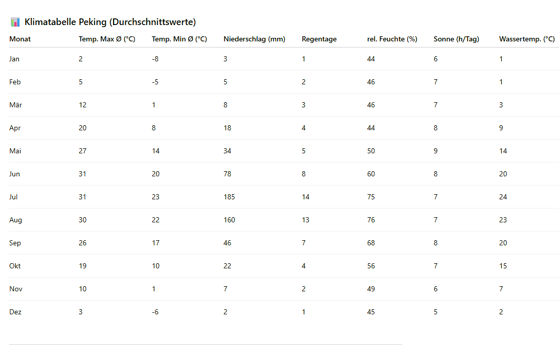 Klimatabelle Peking (Januar – Dezember) Temperaturen: Maximal & Minimal (°C) Niederschlag (mm) & Regentage Relative Luftfeuchtigkeit (%) & Sonnenstunden (h/Tag) Wassertemperatur (°C)