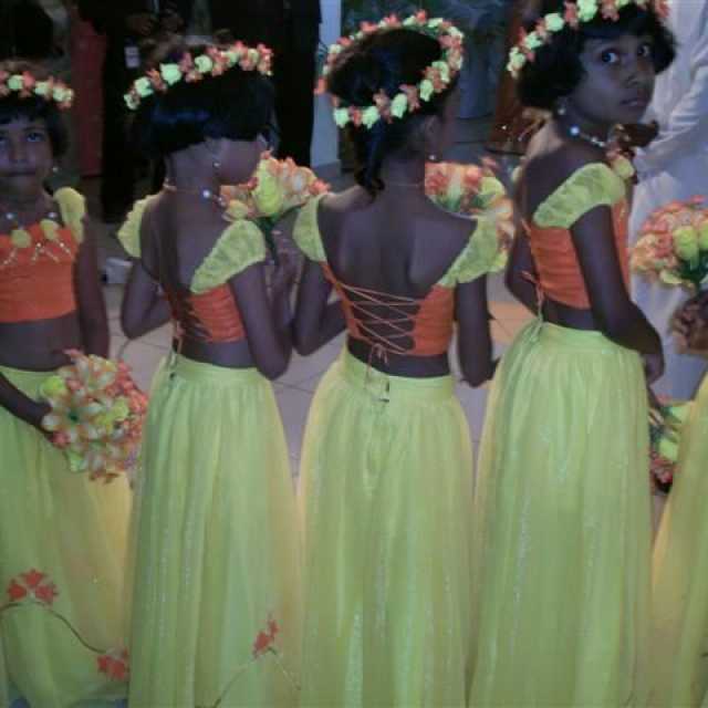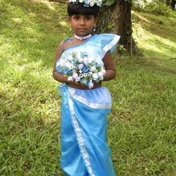 Der traditionelle Sari ist ein indisches Kleidungsstück für Frauen. Es besteht aus einer 7 Meter langen, sehr reich bestickten Stoffbahn mit einer wunderschönen Borte als Saum. Für die kurze Sari-Bluse verwendet man nur 1 Meter. Die Bluse wird an die Trägerin auf den Millimeter angepasst. Die übrigen 6 Meter werden kunstvoll in circa 3 Stunden um die Trägerin gewickelt, an der Schulter beginnend, gefaltet und mit Sicherheitsnadeln befestigt. Diese reich bestickten und einmaligen Saris werden meist nur bei Festivitäten getragen. Und man kann zu Recht sagen, dass ein Sari immer schöner als der andere ist und westliche Kleider dagegen als Uniformen oder langweilige Einheitskleider erscheinen müssen. Die Hochzeitsausstatterin ist Meisterin ihres Fachs.