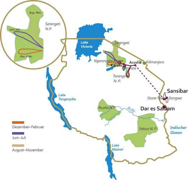 In der Grumeti Game Reserve und Ikorongo Game Reserve bleiben die meisten Tiere bis Juni. Durch den nahen Victoriasee ist diese Region sehr feucht und grün.